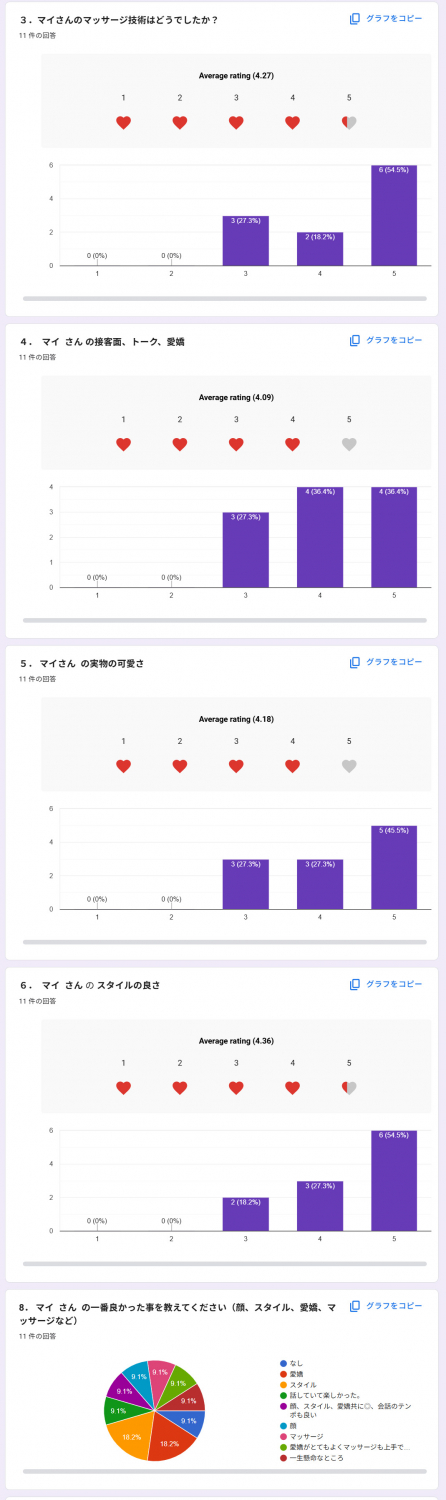 ♡ 愛嬌/ 30代♡顔/40代♡話してて楽しかった。/30代♡マッサージ/50代♡愛嬌/30代♡一生懸命なところ/40代♡顔、スタイル、愛嬌共に◎、会話のテンポも良い/30代♡スタイル/40代