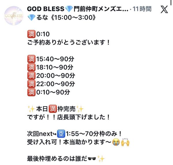 ゴッド・ブレス《GOD BLESS》東京・門前仲町メンズエステ店 11月7日 21:58 ✨🈵⭕✨